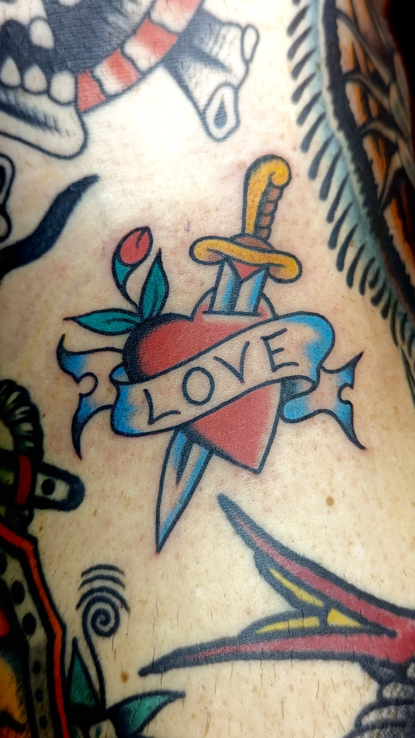 Tattoo of a sacred heart on a person's upper arm. View fullsize